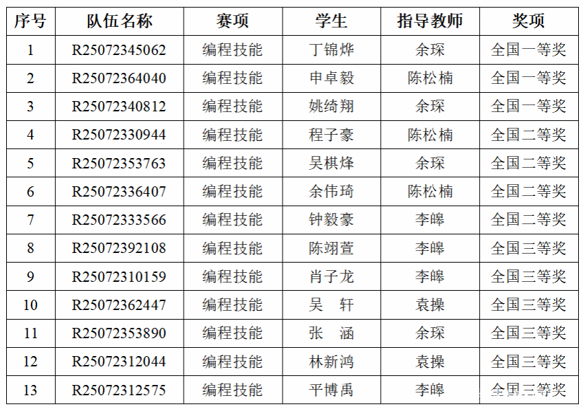 日前,2025年睿抗机器人开发者大赛(RAICOM)编程技能全国总决赛落下帷幕。我校14名学子与全国3800余名学生同场竞技,荣获全国一等奖3项、二等奖4项、三等奖6项,创历史最佳成绩。