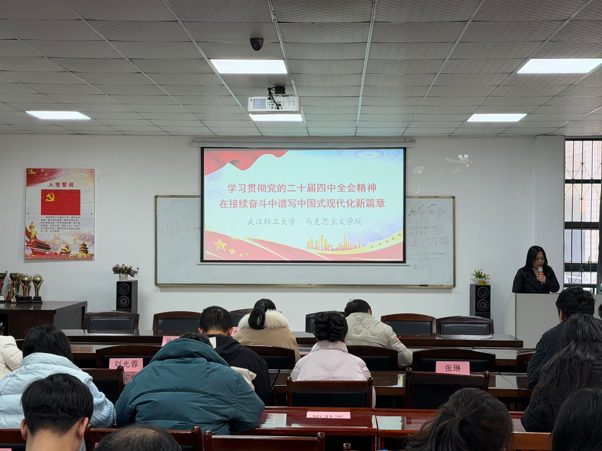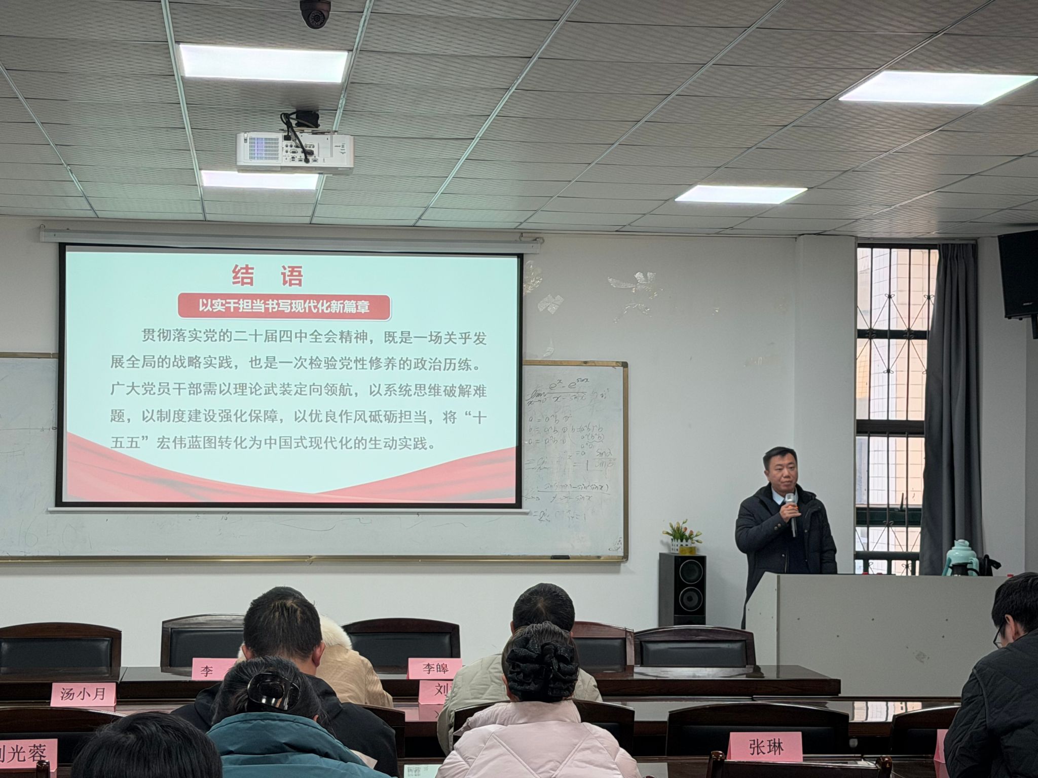 李鑫在主持讲话中表示,阚玉香副教授的报告深入浅出,具备很强的政治性、理论性及实践性,为学院教师深刻理解、深入领会全会精神提供了清晰指导。就如何进一步学习贯彻好全会精神,他向全体教职工提出两点意见:一是要提高政治站位,把学习贯彻党的二十届四中全会精神作为重要政治任务,以高度的政治自觉和行动自觉,多形式推动全会精神进教材、进课堂、进头脑;二是要围绕中心工作,聚焦湖北支点建设和学校13510发展战略,深入落实立德树人根本任务,深化教育教学改革,为湖北经济社会高质量发展提供坚实的科技支撑和智力支持。