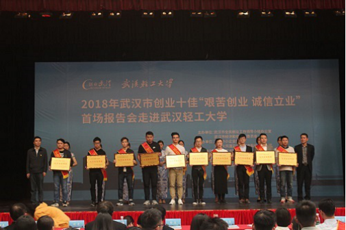 我校团委书记刘竞及武汉市经信委罗处长先后致辞。随后,2018年武汉市创业十佳获奖者依次上台领奖。获奖选手群英荟萃,有海归人才、科研院校技术人、经理人,有返乡创业、离岗创业等群体中的优秀代表。获奖选手创办的企业中,有的在新兴领域独树一帜,有的在传统产业创新升级,多数企业拥有自主知识产权和核心技术。