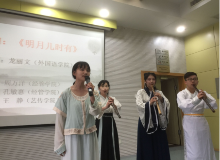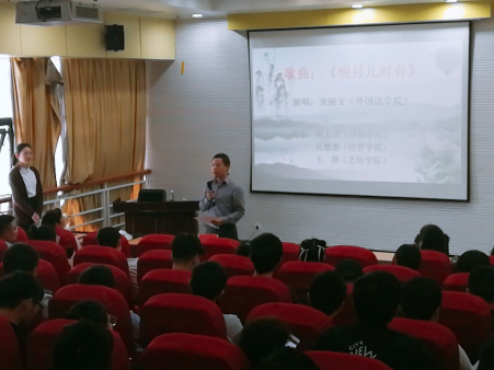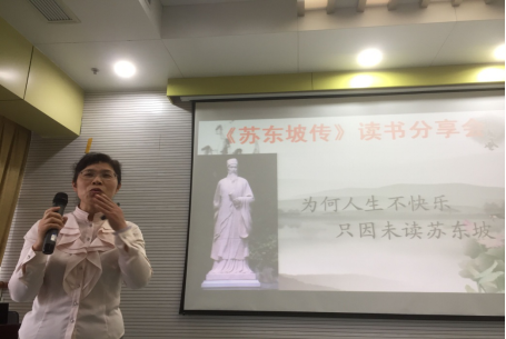 在本次读书分享会中,主讲人杜桂平老师以《苏东坡传》为主题,从各个方面对苏东坡进行了详细的介绍,为大家描述了一个生动真实的苏东坡,并由此展开了对北宋这个时代的介绍,从一个时代的沉浮,到苏东坡个人的传奇人生,让苏东坡一代豪放派诗人的形象跃然于学生脑海。除了主讲人的讲解,本次读书会中还设计了苏东坡诗词朗诵、《明月几时有》歌曲演唱、有奖问答、学生观点陈述等环节,这些趣味盎然的活动,增加了同学们的互动,让同学们对了解苏东坡有了强烈的兴趣。