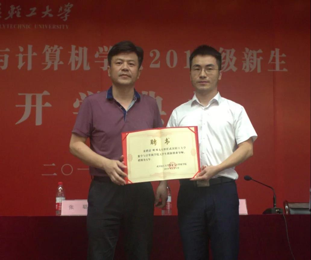 典礼上由张聪院长代表学院宣布聘请校友胡瑞为创业导师,并颁发了聘书,以此来推动校企合作,帮助大学生创新创业。胡瑞是我院2007级信息与计算科学专业的学生,在校期间一直担任班长。他是龙秘书网创始人,现任北京华宝智慧科技有限公司CEO,北京华宝投资管理有限公司CEO,北京博睿时代文化发展中心主任,中国国际经济技术合作促进会大数据委员会秘书长,楚商联合会副会长,共青团中央认证青年创业导师,2018中国科技行业品牌年度人物。