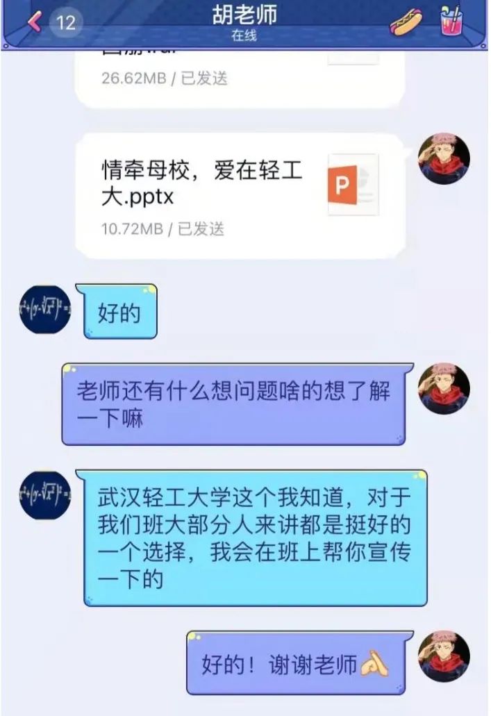 在与高中班主任联系后,我得知学校已经放假,无法进校宣传。于是我将PPT、宣传画册、宣传视频转交给老师,让老师帮忙向同学们宣传。老师表示美高梅MGM电子娱乐游与班上同学匹配度较高,也是他们心中的理想院校,会大力推荐班上学生报考。