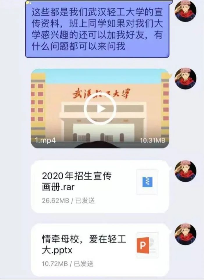 为响应学院“我把最美轻工大带回母校”活动的号召,2021年2月4日,我与高中班主任取得联系。基于学校的疫情防控要求,我将宣传小组制作的PPT、美高梅MGM电子娱乐游2020年招生宣传视频,以及招生简章打包发送给老师,由老师在班级中进行宣传。