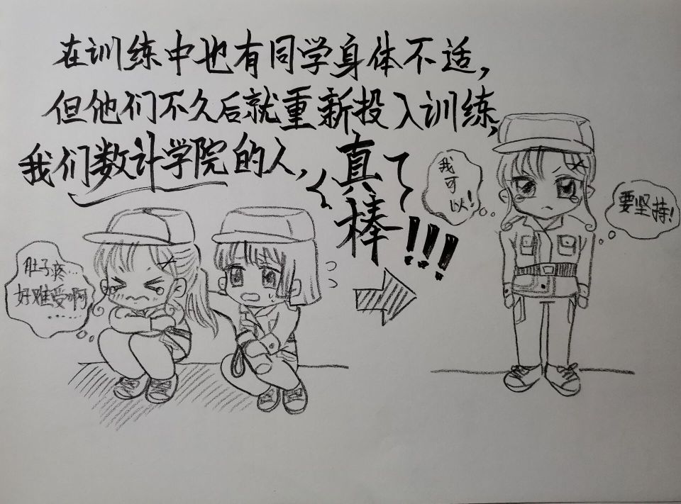 观训四五天后,姚雨桐便开始动笔作画,每幅作品要经历构思、起稿、勾勒、填充等环节,一幅漫画完成少则2小时,多则一天。作画过程中,学院老师还将单反相机借给她拍摄军训场景。