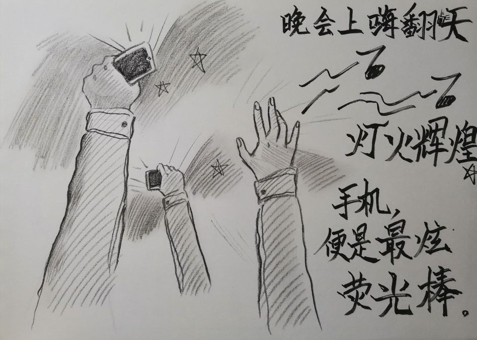 在军训的第一天,姚雨桐就萌生了画漫画记录军训的想法。当天晚上,学校组织迎新晚会,热闹的氛围让来自天南海北的同学们熟络了起来,这让远离家乡的她受到触动,想到用画笔记录下美好的一刻。