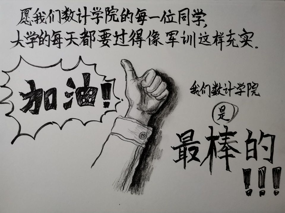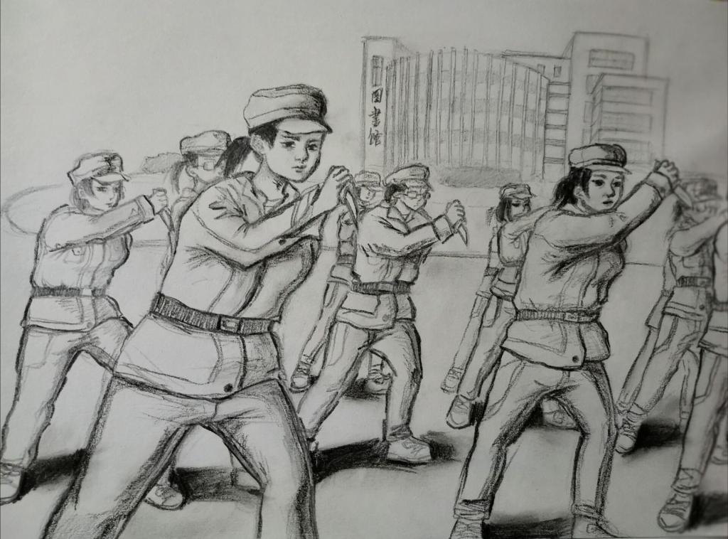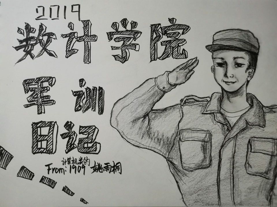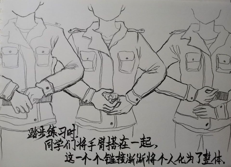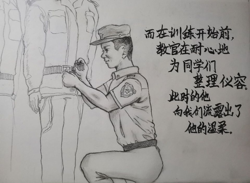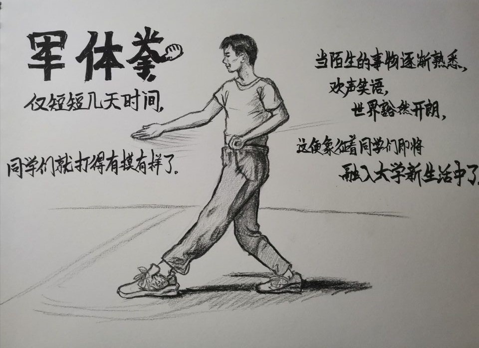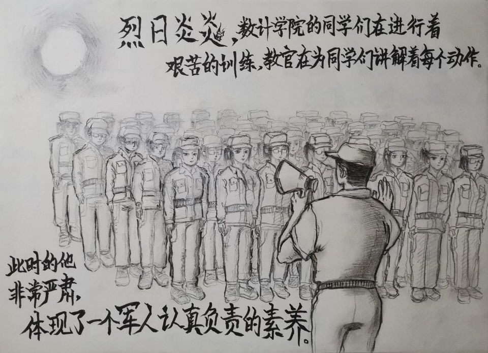 十几天下来,打得有模有样的军体拳、并肩作战半个月的“战友”、训练时严肃认真的教官、迎新晚会上的璀璨灯光……军训场景一一入画,军训结束后,她的画作达到十一幅。“有的地方还不尽如人意,但是每一幅画我都画得很认真。”姚雨桐说,“这也算是以另一种方式参与到军训中!”