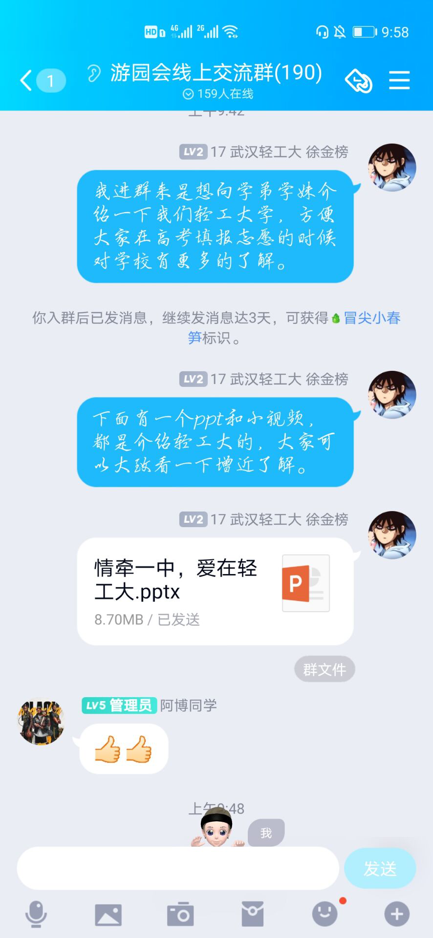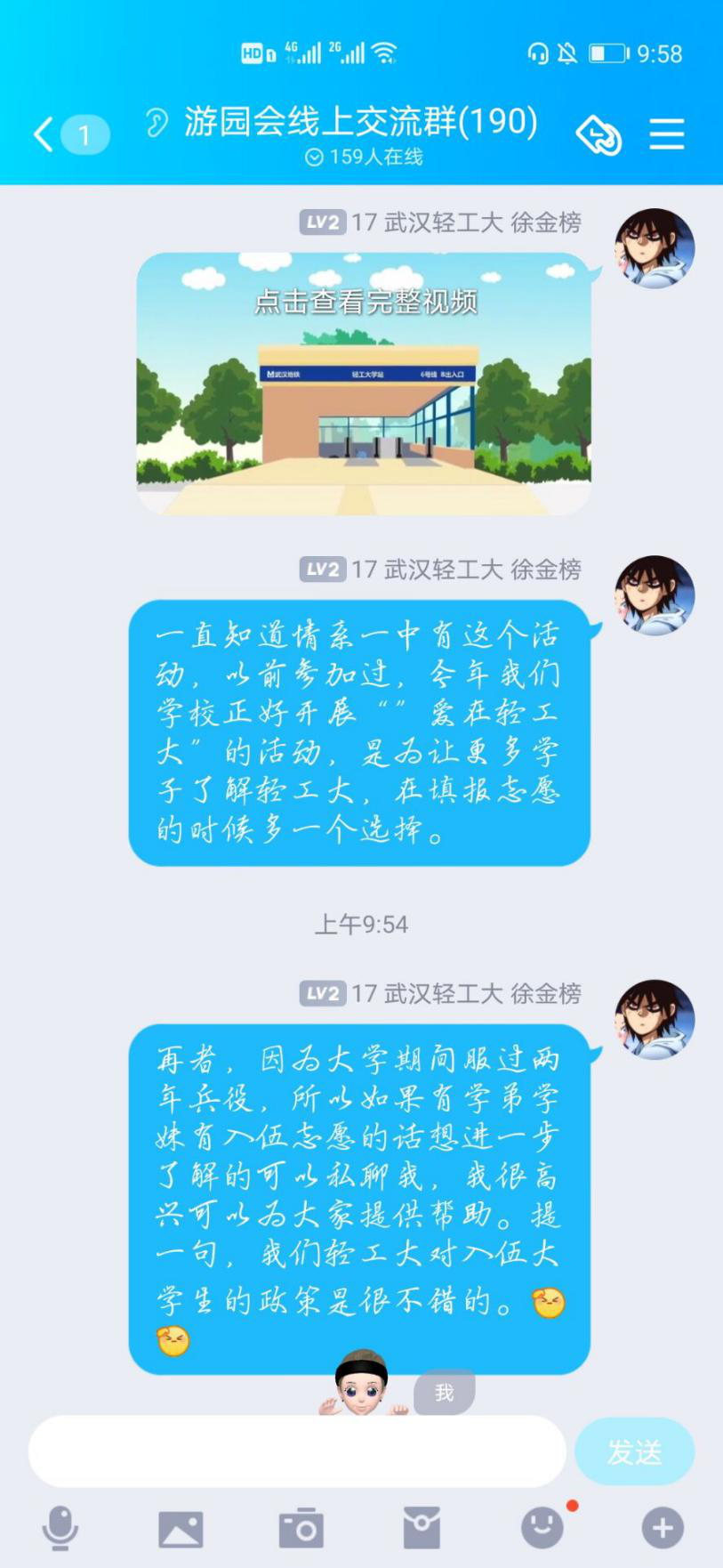 2月4日,我进入了英山一中游园会的线上交流群。此次游园会活动在增进一中学子对大学的了解,帮助其尽早树立考学目标上有着重要的意义。我将轻工大学的宣传资料发进群里,同时借助自己的参军经历,吸引到同学向我询问了解美高梅MGM电子娱乐游.