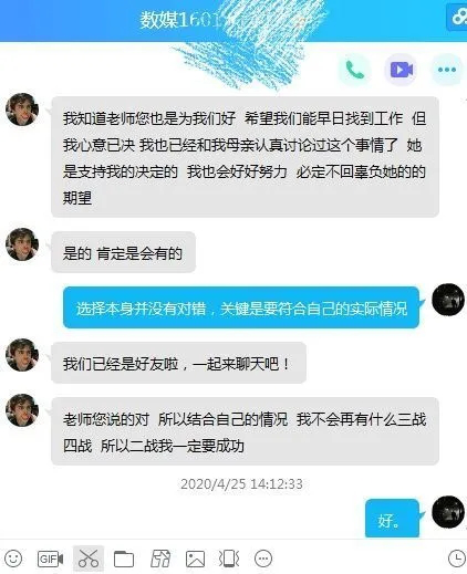 会议从下午2点一直开到6点。部分学生长时间线上等待,导致手机停电,会后还专门向老师发来信息,报告自己的论文和就业进展,师生互动有序而融洽。
