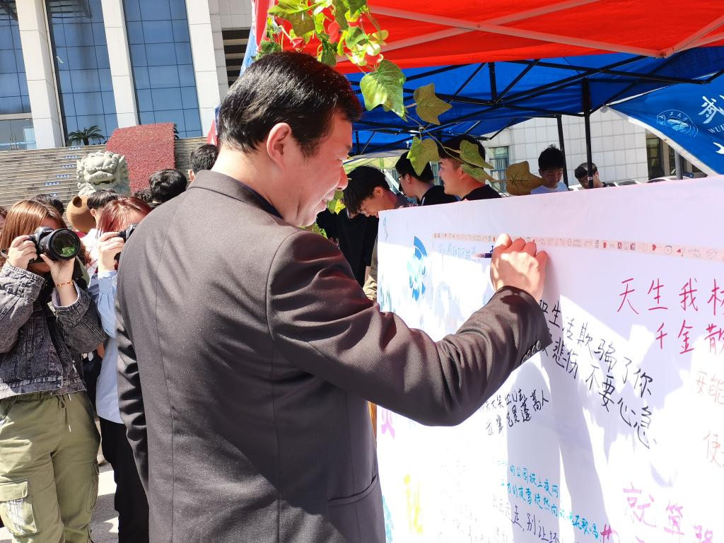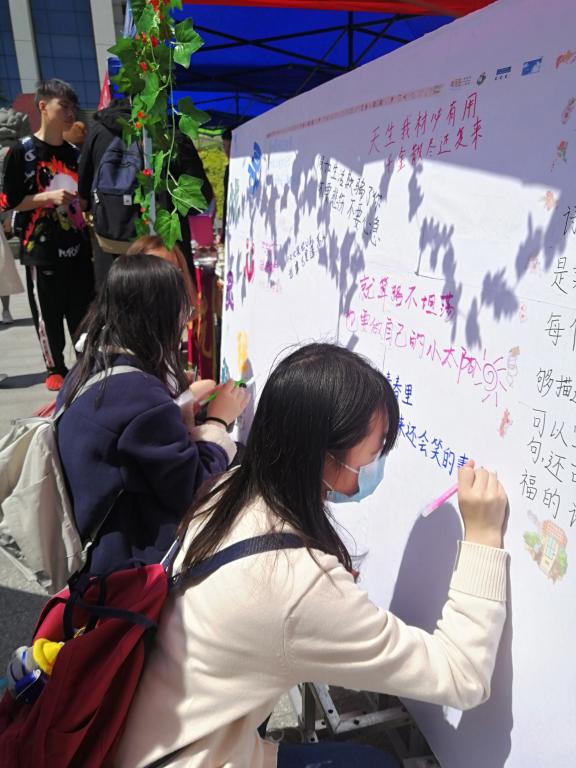 3月25日中午,我院组织学生参加了学校心理健康教育节的开幕式。其中,由我院设计的“寻找心灵秘籍”和“心灵驿站”两个互动环节,轻松有趣,参与率高,受到了现场同学们的热烈欢迎。副校级干部陈伟也到现场留下了“心灵寄语”。