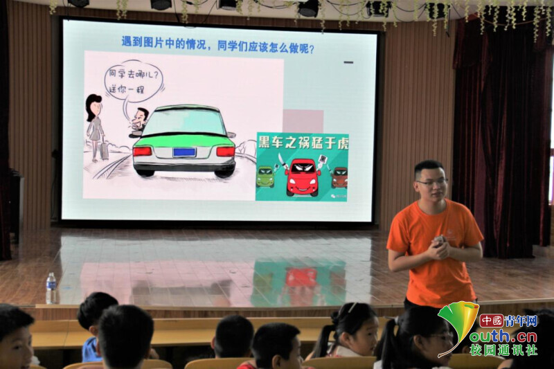 图为午晨旭在给格林斯学校学生讲述遇到“黑车”时的正确应对方式。中国青年网通讯员 胡雨婷 摄