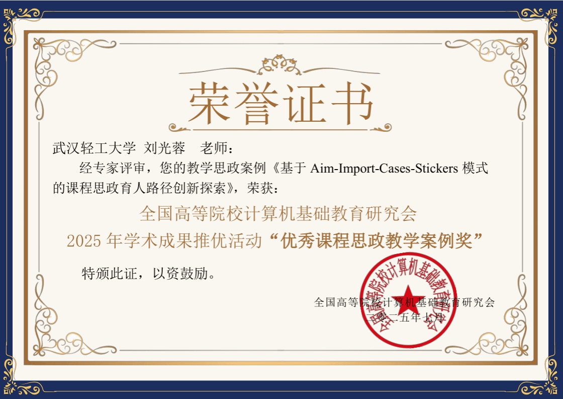 此外,刘教授的教学思政案例《基于Aim-Import-Cases-Stickers模式的课程思政育人路径创新探索》,在全国高等院校计算机基础教育研究会2025年学术成果推优活动中获“优秀课程思政教学案例奖”,彰显AICS范式的行业认可度。